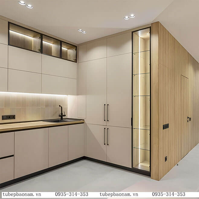 Tủ bếp gỗ công nghiệp TB05 với màu kem tinh tế và kết hợp tủ đứng và cánh nhôm kính tạo ra một không gian bếp sang trọng và hiện đại. Với sự kết hợp độc đáo này, nó là một lựa chọn lý tưởng để tạo ra một không gian bếp đẳng cấp và độc đáo trong ngôi nhà của bạn.